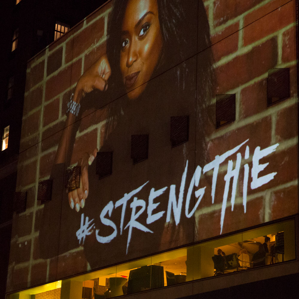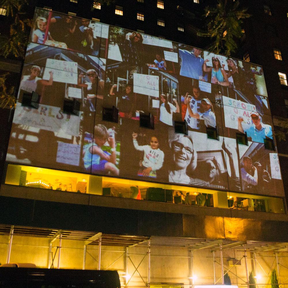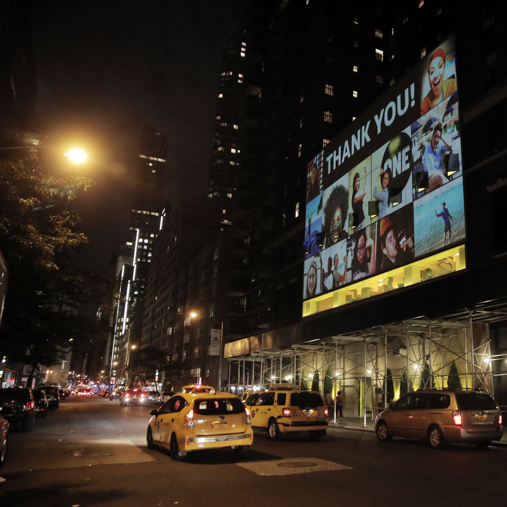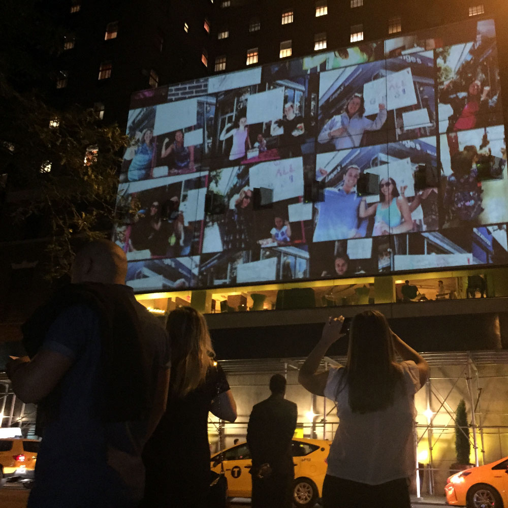 The ONE Campaign asked Optical Animal to projection map the Hudson Hotel for an event during the UN General Assembly. We developed animated motion graphic narrative which included the group’s mission statement, as well as a mosaic of live-updating photos from supporters tweeting around the world. We also set up a wireless system for our team of photographers to instantaneously add new photos taken at the event to the projected mosaic.