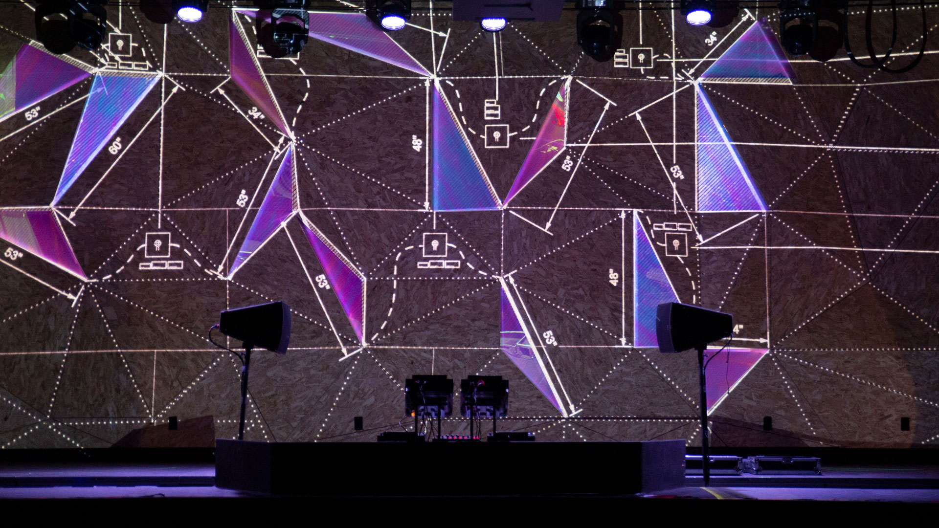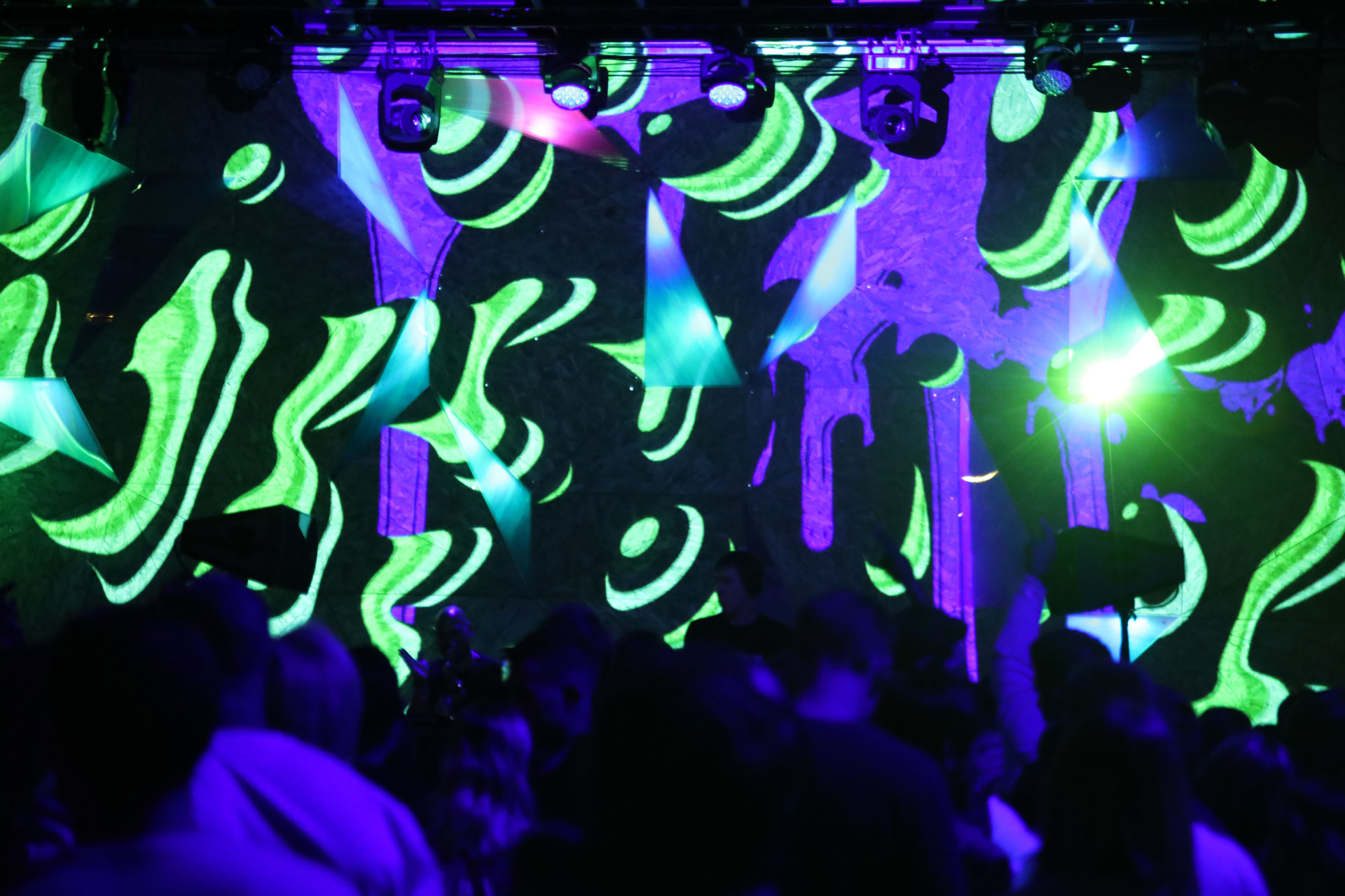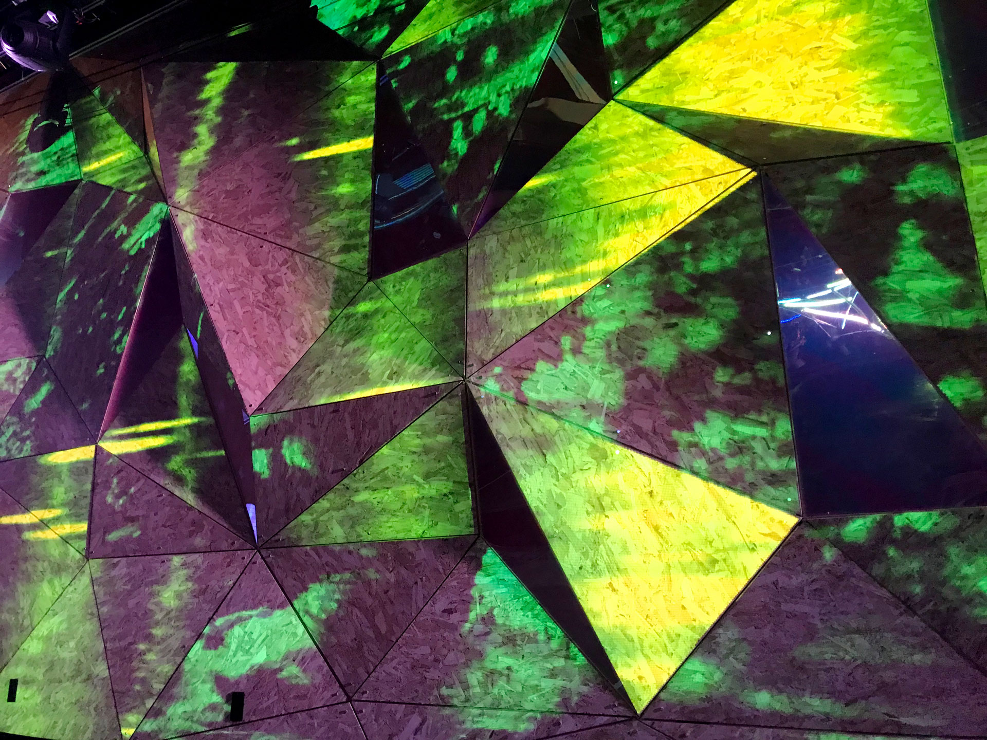 Elsewhere Brooklyn brought on Optical Animal to design and program their in-house live-visuals system to illuminate the venue's sculptural upstage wall with projection in a flexible, simple-to-manage way. OA also programmed the triangular dichroic LED sections of the surface to integrate with the projections, so that velocity and color would be continuous across both systems to create a cohesive vibe. In addition, Optical Animal continues to develop custom projection content to update the system periodically with fresh looks.