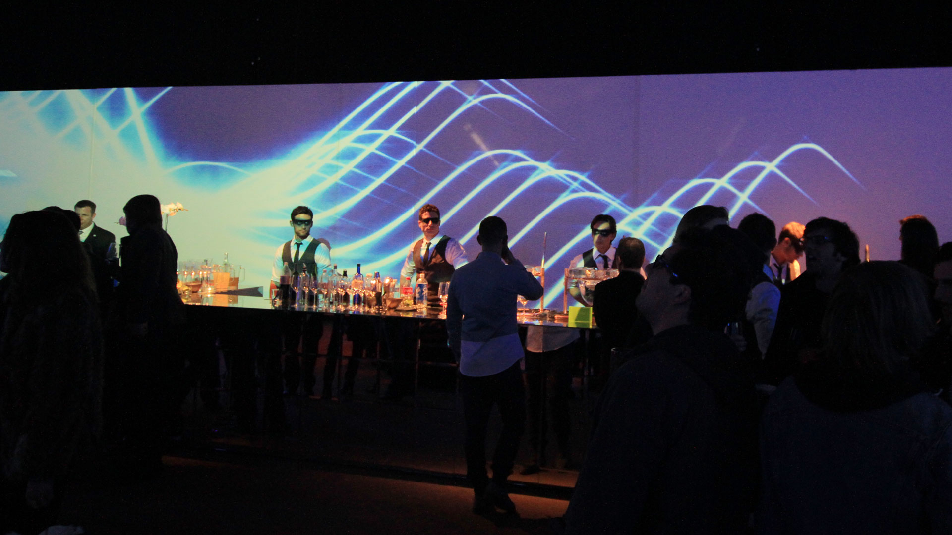 OA designed, fabricated, and installed a 3D projection cube suspended above the center of the space, created a system for guests to play the new device with gameplay amplified and projected onto the walls of the venue, illuminated the bar with original Playstation-inspired animations, projected a live twitter feed, and welcomed arriving guests with an outdoor facade projection above the entrance to the venue.